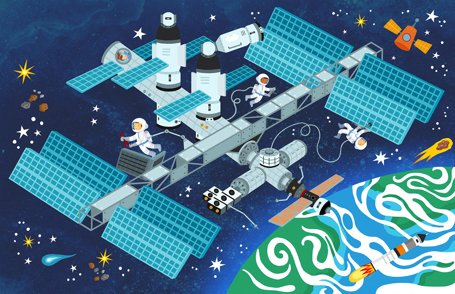 Space Night Blue Rockets International Space Station Men Astronauts Working Stars Planets Asteroids ALST*