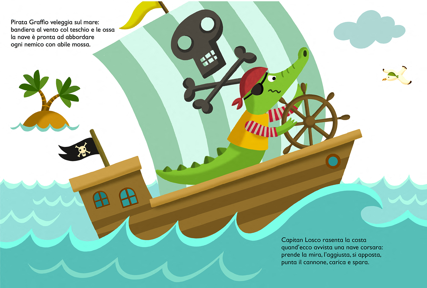 Pirate Crocodile Boat Rudder Flag Island Sea Waves Bird ALST*
